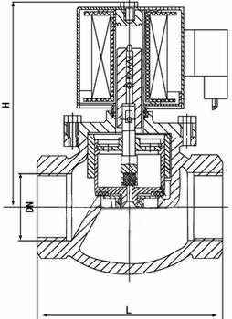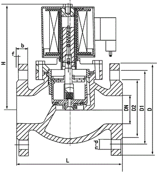 本阀为分步动作直接先导式电磁阀,可根据断电时所处开、关状态的不同,可分为常闭式电磁阀和常开式电磁阀。常闭电磁阀,线圈通电后,衔铁在电磁力作用下先带动副阀阀塞提起,主阀阀杯上的流体经副阀流走,减少了作用在主阀阀杯上的压力,当主阀阀杯上的压力减少到一定值时,衔铁带动主阀阀杯,并利用压差而使主阀阀杯开启,介质流通。线圈断电后,电磁力消失,衔铁因自重下落复位。同时依靠介质压力,主副阀得以紧密关闭。常开电磁阀,线圈通电后由于吸力作用,动铁芯下移,把副阀阀塞压下,副阀关闭,主阀阀杯内压力上升,当压力升到一定值时,主阀阀杯的上下压差一样,由于电磁力作用,动铁芯推动主阀阀杯下,压紧主阀阀座,阀门关闭。线圈断电时,电磁吸力为零,副阀阀塞和动铁芯由于弹簧作用向上提起,副阀打开,主阀阀杯上的流体经副阀流走,减少了作用在主阀阀杯上的压力,当主阀阀杯上的压力减少到一定值时,利用压差把主阀阀杯推起,主阀打开,介质流通